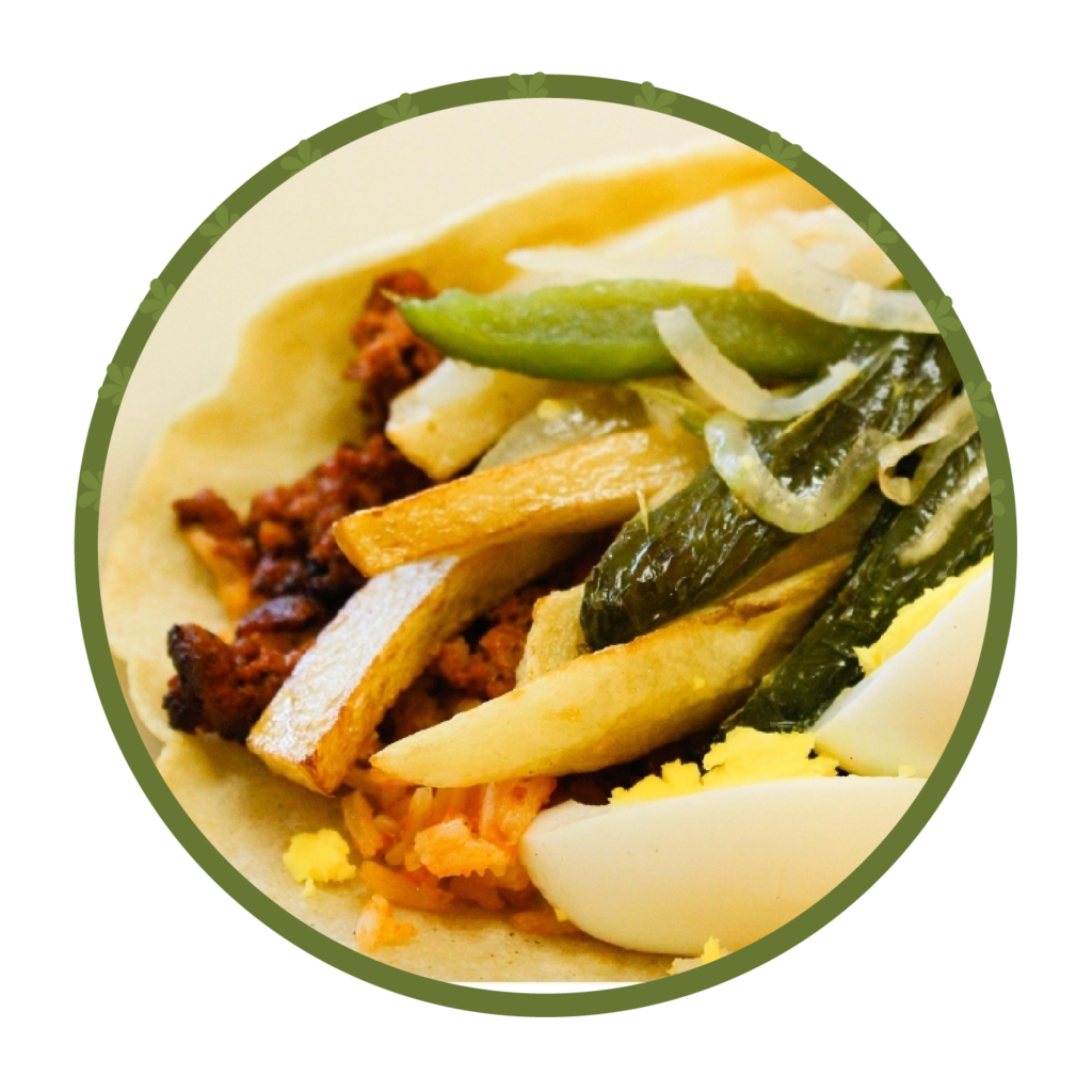 Tortilla grande de maíz, cubierta de arroz, huevo hervido, carne de tu elección, papas caseras, cebolla frita y chile toreado. Big corn tortilla, topped with rice, boiled egg, meat of your selection, homemade potatoes, fried onions and grilled jalapeno. $ 16