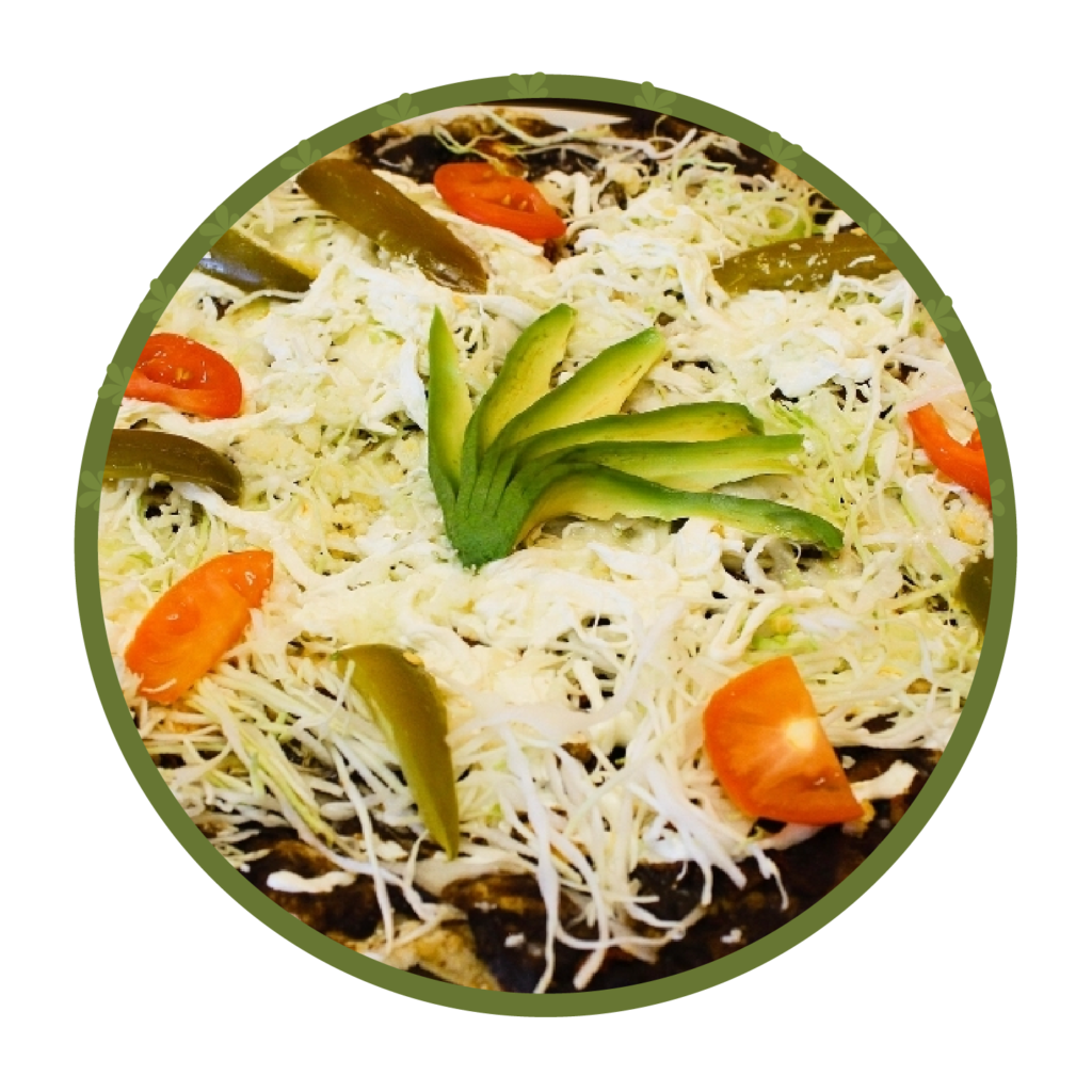 Tortilla redonda cubierta de frijol, queso Oaxaca, repollo, jalapeño, tomate, aguacate, la carne de tu elección. Big tortilla covered with beans, oaxaca cheese, cabbage, jalapeño, tomatoes, avocado and meat of your selection. $ 17 MIXTA $ 18